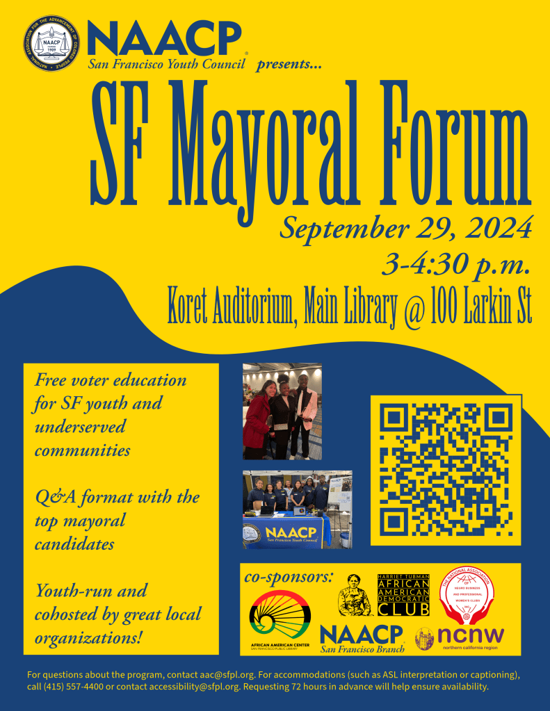 We are hosting a mayoral forum with the Harriet Tubman African American Democratic Club, the adult SF NAACP Branch, the SF BPWC, the SFPL African American Center, the Northern California Region of the NCNW, and more organizations to come, to give youth and other voters a chance to hear from top mayoral candidates in a Q&A-style forum, moderated by the youth.