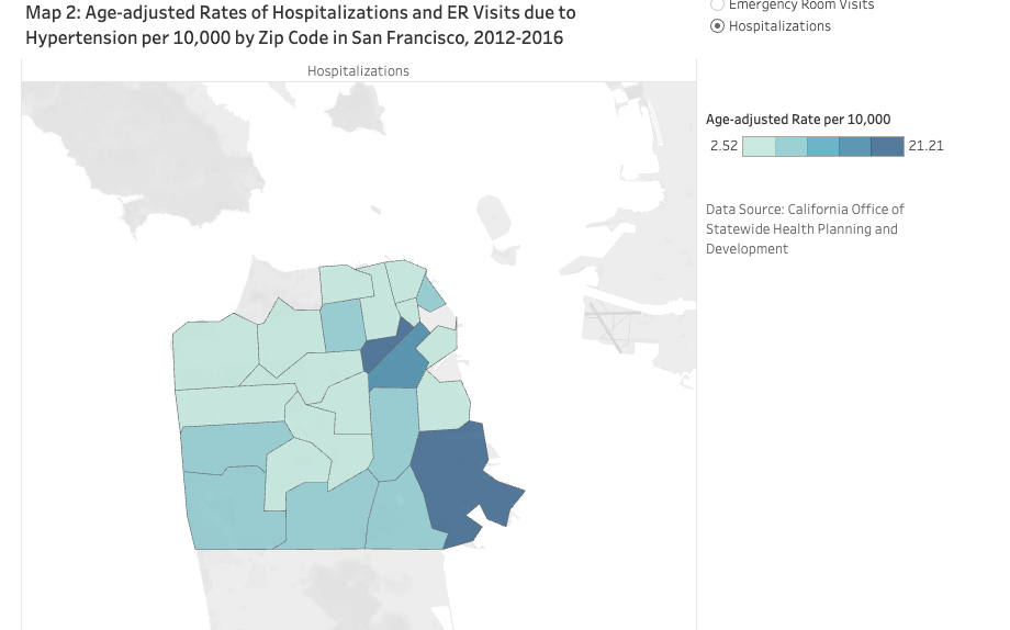 We also learned about the lasting health impacts of redlining in San Francisco, and how specific zip codes have higher hospitalization rates for chronic conditions like hypertension due to generational food insecurity and health inaccessibility. View a comparison of a health map and a redlining map below.
